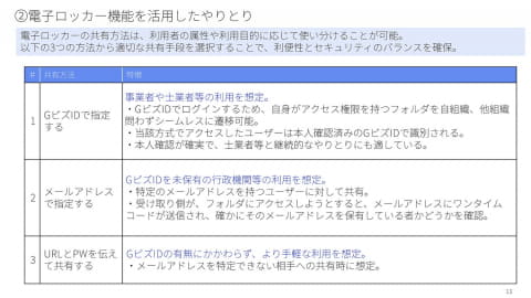 なおファイルの共有方法は、「GビズIDで指定」「メールアドレスで指定」「URLとPWを伝えて共有」の3種類を提供予定で、セキュリティを担保する。容量は申請につき1GBまで対応可能で、ファイル数の制限などはない。