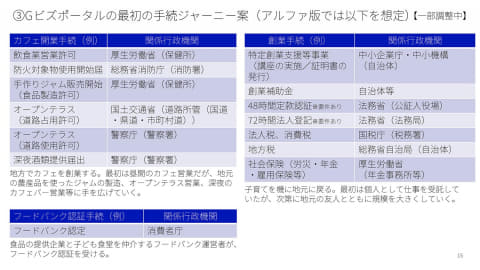 一方、これらの申請先は厚生労働省(保健所)、総務省消防庁(消防署)、国土交通省などに別れておりわかりにくい。こうした必要な手続きを事業や業態に合わせてわかりやすく紹介するものが「手続きジャーニー」となる。α版では、カフェ開業手続き、フードバンク認証手続き、創業手続きなどを展開予定。