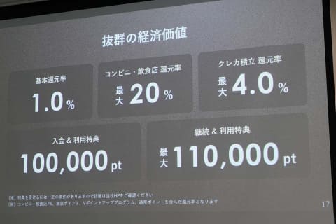 ポイント付与率は基本1%だが、対象のコンビニ・飲食店で最大20%とする。また、SBI証券のクレカ積立は最大4%を付与する。保険は、海外・国内旅行最高1億円。2026年度には「メタルカード」の発行も予定。価格は33,000円。