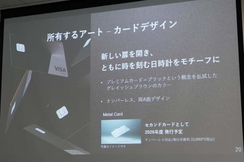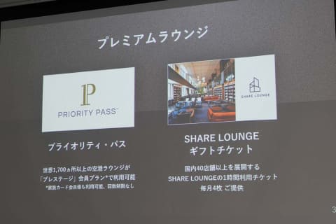 また、空港ラウンジが使える「プライオリティ・パス」、シェアラウンジの「SHARE LOUNGEギフトチケット」を毎月4枚、IHGホテルズ&リゾーツなどの「ホテルステータスマッチ」、東京国立近代美術館などの優待を行なう「ミュージアムパス」などのプレミアムサービスも提供する。
