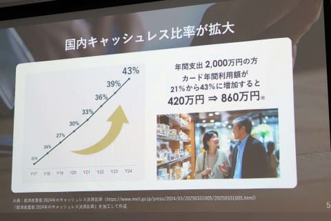背景としては、日本の「富裕層」が拡大しており、2021年の約149万人から、2023年には165万人となり、金融資産が10億円を超える「超富裕層」も拡大傾向にあることを挙げる。加えて国内のキャッシュレス比率も高まっており、24年度は約43%となっており、年間支出2,000万円の人がカードを集約すると860万円がカードで支払われることになる。