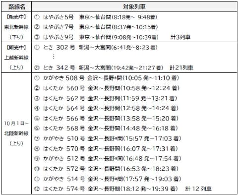 北陸新幹線の対象区間は、金沢~長野間の上り。対象列車は計12列車。販売方法はアテンダントによる対面での車内販売。