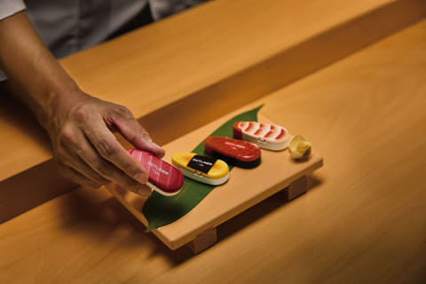 寿司ドットライナーは、まぐろ、たまご、いくら、えびの4種、およびシークレット1種の計5種。ネタが乗った寿司のモチーフに、マットなグラデーションを取り入れたグラフィックを掛け合わせ、オリジナルなデザインに仕上げた。