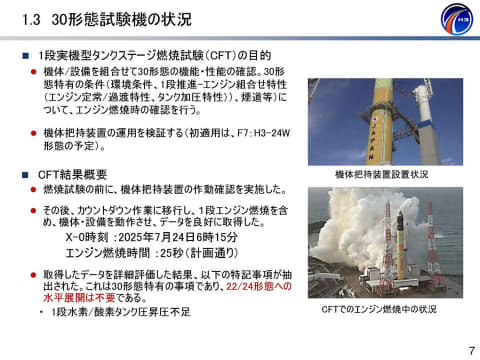 7月には種子島宇宙センターで30形態の機体をロケットを発射台に据えて機能と性能を確認する1段実機型タンクステージ燃焼試験(CFT)が実施されました。1段エンジンを25秒間燃焼させ、機体・設備の動作データをしっかりと取得することができました。試験で十分な性能が確認できれば2025年度中に30形態の初打上げへと進む計画でしたが、3基の1段メインエンジン「LE-9」に水素燃料と酸素を供給するタンクの圧力が必要な水準まで達しないという事象が発生しました。