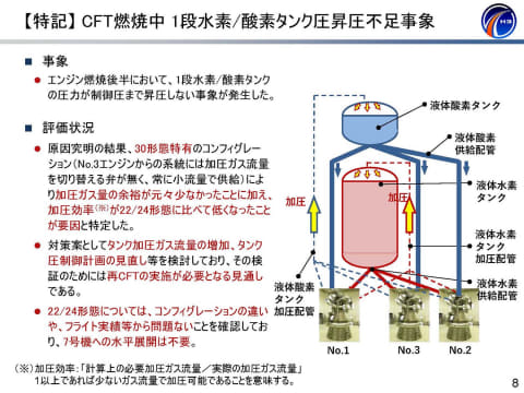 原因を調査した結果、追加した3番目のエンジンからの推進剤系統には加圧ガスの流量を切り替えるバルブがなく、常に少しずつ流すかたちで供給しているために加圧ガス量にもともと余裕が少なかったことなど、メインエンジンが3基ある30形態に特有の事情で圧力不足が発生したことがわかりました。このため、10月に打上げ予定のH3ロケット7号機(HTV-X 1号機搭載)などH3 22/24形態ではこの問題は発生しないといいます。