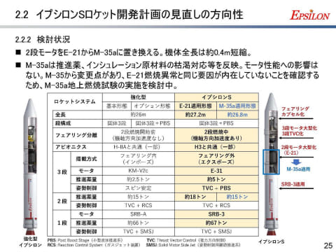 その方策として、イプシロンSで開発中の推進薬を増強した2段モータ「E-21」をいったん、2022年10月まで運用されていた「強化型イプシロン」の2段モータ「M-35」に戻すことが検討されています。すでに製造されていない部品があるため、代替品を採用した「M-35a」とする方策を検討中です。