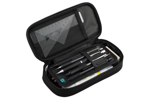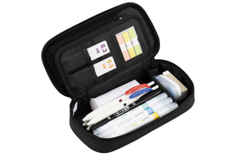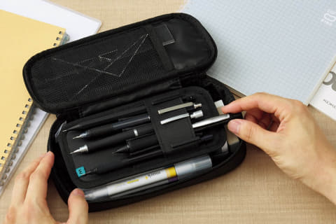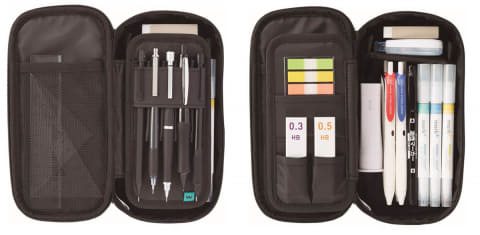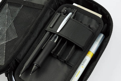 内装は2層構造で、上段がお気に入りの筆記具をきれいに並べられる波なみホルダーのスペース。下段は他の筆記具や消しゴムなどの小物を分けて収容できる広いスペースとなっている。そのほか、ふせんやシャープペンの替芯を収められる小物ポケット、中身を確認しやすいメッシュポケットを設けた。