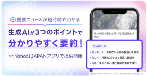 LINEヤフーは、「Yahoo! JAPAN」アプリでニュース記事を3つのポイントで要約する新機能「AIまとめ」の提供を開始した。対象は、同アプリ内の「Yahoo!ニュース トピックス(ヤフトピ)」に掲載された一部記事。生成AIが「何があった」「詳しく」「今後」「補足」といった観点から要点を整理し、3つのポイントとして表示する。