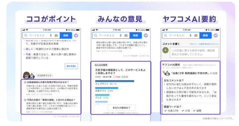 ヤフトピではこれまでも生成AIを活用した取り組みとして、「ココがポイント」「みんなの意見」「ヤフコメAI要約」などを展開してきた。「ココがポイント」では、記事に対する補足情報をAIが整理して表示し、「みんなの意見」では、話題のニュースに関連した投票テーマをAIが提案し、「ヤフコメAI要約」では、寄せられた意見をAIが要約することで、社会の反応を把握しやすくしている。