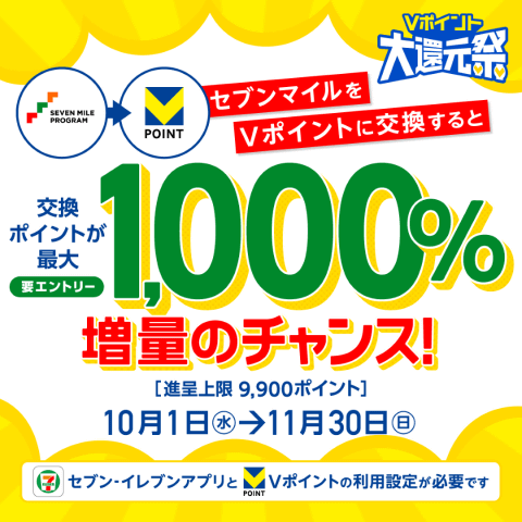 加えて、10月1日~11月30日のキャンペーン全期間中は「セブンマイル」からVポイントへの交換でも抽選によるポイント増量が行なわれ、最大1,000%の増量分が付与される。2等は500%、3等は300%、4等は200%、5等は交換ポイント数にかかわらず5ポイントが付与される。獲得本数は20万本。ポイント還元上限は9,900ポイント。