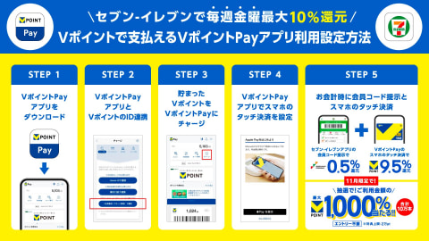 参加には、「セブン-イレブンアプリ」と「VポイントPayアプリ」といった各種アプリのダウンロードや、Vpassアプリおよび7iDとVポイントの紐付け、また、三井住友カードが発行するクレジットカードを「スマホのタッチ決済」として設定することなどが必要となる。支払い時には、「セブン-イレブンアプリ」の会員コード提示と所定のスマホ決済を行なう必要がある。