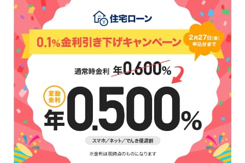 2026年2月27日までに住宅ローンの事前審査に申し込み、2026年3月31日までに変動金利で新規借り入れまたは借り換えを完了すると対象となり、金利が通常0.73%のところ年0.63%となる。