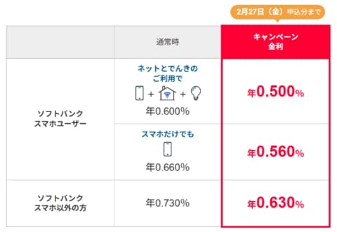 ソフトバンクのスマホユーザーは「スマホ優遇割」により通常年0.66%のところ年0.56%に、さらに固定インターネット(SoftBank光/SoftBank Air)と電気(おうちでんき/自然でんき)をあわせて契約する「スマホ/ネット/でんき優遇割」では通常年0.6%のところ年0.5%となる。