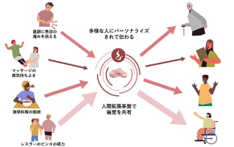 痛覚に関するデータを把握する機器(センシングデバイス)、痛覚の感度に対する個人差を推定し共有する「人間拡張基盤」と、痛覚を再現する駆動機器(アクチュエーションデバイス)の3つを基本として構成。