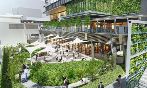 建物建設を1期工事、2033年度に整備する緑地広場を2期工事として進められる。