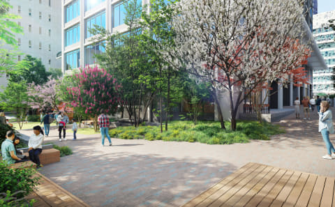 エリア最高層となる約160mの高さを誇るミクストユース型施設でありながら、敷地全体の約50%を来街者が日常的に利用できる豊かなパブリックスペースとして計画。敷地内には樹高3m以上の樹木を159本植え込み、豊かな自然環境を創出する。南側には歩行者専用の区道を新設するとともに緑地広場も設置する。