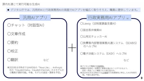 源内では、チャットや文章作成、校正などの基本的な活用だけでなく、デジタル庁職員が開発した「Lawsy(法制度調査支援AI)」「国会答弁検索AI」「公用文チェッカーAI」など20種類以上の用途・目的特化型AIなども利用されている。