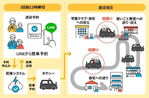 小学校や学童、習い事教室などと自宅の間をタクシーで送迎する。TOPPANの相乗りタクシー送迎サービス「こどもび」を通じて提供される。相乗りの場合は乗車距離に応じて送迎利用料が按分されるため、安価に利用可能。利用者はスマートフォンアプリを通じて予約や位置情報の確認ができる。また、インターホンと連動し、自宅室内でタクシーの到着を把握できるため、子どもが屋外で待つ必要がない。スマートフォンを所持していない子どもでも安全に乗降できることが特長。