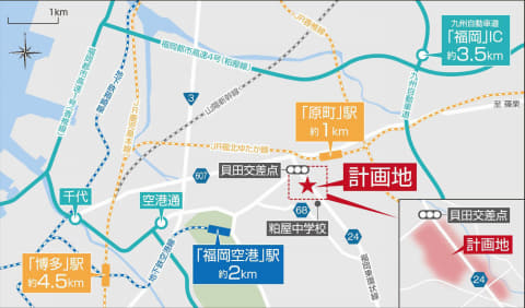 福岡県糟屋郡粕屋町の主要地方道沿いにおいて、福岡空港・博多駅・福岡インターチェンジ・博多港などの主要施設から30分以内のアクセスという立地特性を活かし、持続可能なまちづくりを目指す「(仮称)粕屋町仲原東・志免町別府土地区画整理事業」。3社による共同企業体が、粕屋町仲原東土地区画整理事業準備委員会および志免町別府土地区画整理事業準備委員会との間で、業務代行予定者基本協定を締結し、同事業の業務代行予定者に選定された。