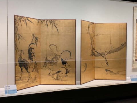 その話題となった、円山応挙が天明7年(1787)に描いた《梅鯉図屏風》と、伊藤若冲が寛政2年(1790)以前に描いた《竹鶏図屏風》が展示されている。
