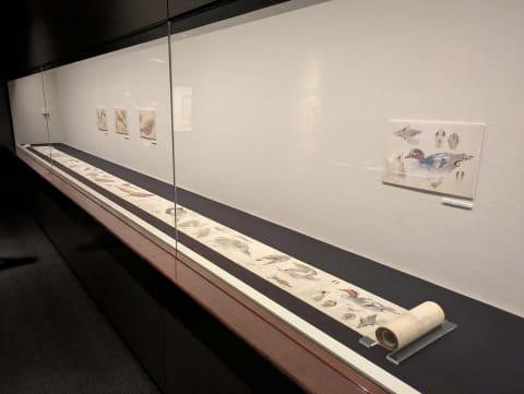 ただし写生を重視した画家は、先述の伊藤若冲をはじめ、それまでにも少なくない。少し前の世代の渡辺始興(わたなべしこう)は、そうした1人であり、円山応挙が私淑した人でもある。今展では、渡辺始興が野鳥などを写生した同館所蔵の《鳥類真写図巻》と、それを円山応挙が写した東京国立博物館蔵の《写生帖》が、並べられているのも興味深い。