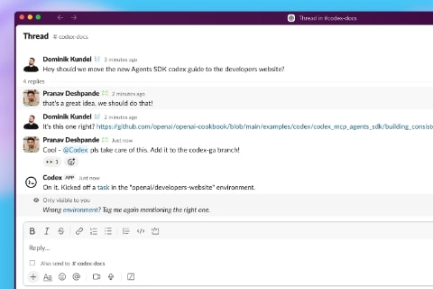 新機能のひとつである、Slack統合ではチームのSlackチャネルやスレッドで「@Codex」をタグ付けすると、会話内容に基づいてタスク・処理を自動的に受け取り、Codexクラウド上で実行。出力結果もSlack上に返信されるため、そのままマージや反復作業に移行できる。