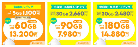 また、期間限定で提供されていた「60GB(365日間) 13,200円」「90GB(90日間) 7,980円」「180GB(180日間) 14,880円」は、「いつものトッピング」としていつでも購入できるようになる。