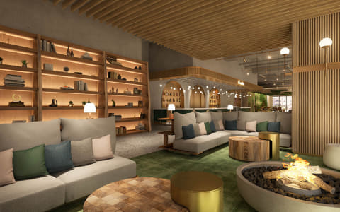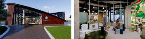 スターバックスは、街区内に設置される「TRACKS PARK」の象徴的な建物に出店。愛犬と過ごせる客席空間を備える。