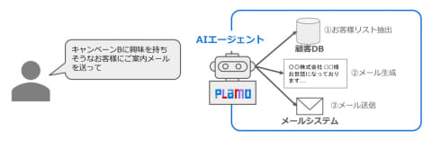 社内システムからキャンペーンに興味が持ちそうなユーザーを抽出し、案内メールを生成、リストに対して自動で送信するなどのフローも自動化できる。