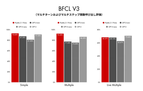 これまでのPLaMoでも特定ツールの呼び出しを指示すれば外部システムと連携可能だったが、今回のアップデートにより、ユーザーが指示した条件にあった適切なツールの呼び出しが可能になり、ツール呼び出し性能のベンチマーク(BFCL V3)でも高評価を得ている。
