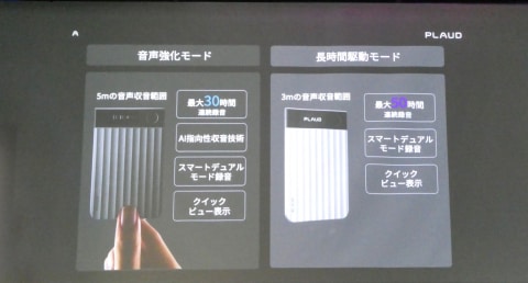 Plaud Note Proは、屋外視認性に優れる600ニトの高輝度有機ELディスプレイとGorilla Glass採用による堅牢性を備え、さらに4基のMEMSマイクにより集音性能を高めた。また、ノイズ抑制が可能な「AI指向性集音技術」を搭載。さらに録音モードも強化されており、対面と通話を自動で切り替える「スマートデュアルモード録音」、5メートル先まで音を拾う「音声強化モード」、最長50時間連続録音が可能な「長時間駆動モード」など、多様な環境への対応力を高めた。