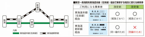 制度面では、JR他社にまたがる乗車に「通算加算方式」を導入し、全区間の距離に対してJR各社の乗車区間分の加算額を上乗せして運賃を算出する。また、東京~熱海間では東海道新幹線と東海道本線(在来線)を別線として扱い、新幹線経由と在来線経由を区別して発売する。なお、東海道新幹線(東京~熱海間)を含む定期券は値上げとなるが、利用方法に変更はない。