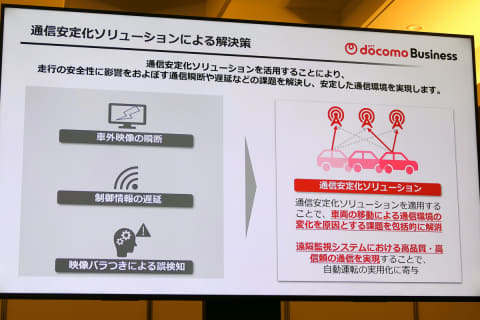 NTTドコモビジネスとNTTは、自動運転に必要な通信と監視システムの技術を組み合わせてソリューションとしてパッケージ化した。自動運転車両と遠隔監視システム間を複数回線でのマルチパス接続を行なうとともに、無線品質の変化を先回りして予測。マルチパスを制御することで、遠隔監視の映像が途切れるリスクを抑制した信頼性の高い通信環境を提供する。複数データをリアルタイムに遠隔監視システムへ連携することが可能となる。