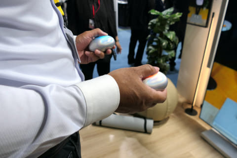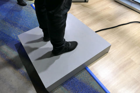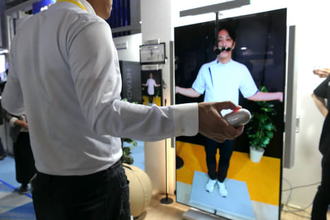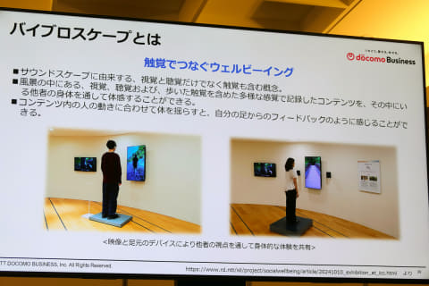 今回は、トレーナーと体験者が専用デバイスを両手に持って、感覚と腕や足の動き・リズムを伝えつつ、肩甲骨運動や前屈、足踏み運動などが紹介された。視聴覚以外に、足元の振動による触覚も使うことで「バイブロスケープ(視聴覚+触覚を含めた環境風景概念)」の伝送も合わせて、デモが行なわれた。