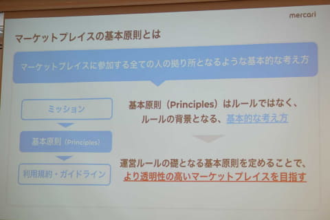 メルカリの日本事業を統括する執行役 SVP of Japan Businessの山本 真人氏は、「マーケットプレイスの基本原則」の成り立ちなどについて説明。特にコロナ禍における「マスク転売」などの問題をうけて、メルカリ運営上の課題に対応するため、「違法」「適法」だけでない、一貫した判断基準が不可欠になるとして原則を策定し、約5年間運用してきた。この原則=「考え方」を元にマーケットプレイスを運営しているが、基本的には「自由な取引を通じた需給のマッチングが最大限に発揮される」場所を目指している。