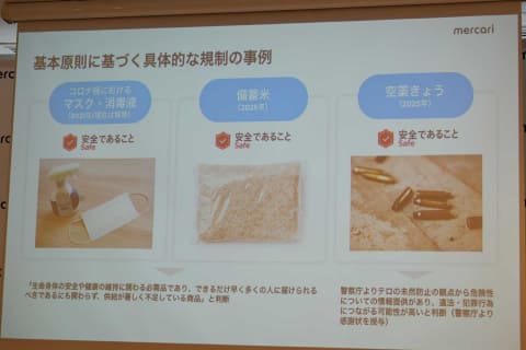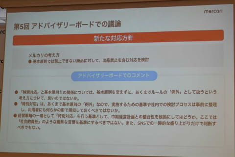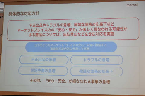 この対応は「マーケットプレイスの基本原則」の枠外の特別措置として導入するもの。メルカリの「経営判断」として、出品禁止措置を判断していく。
