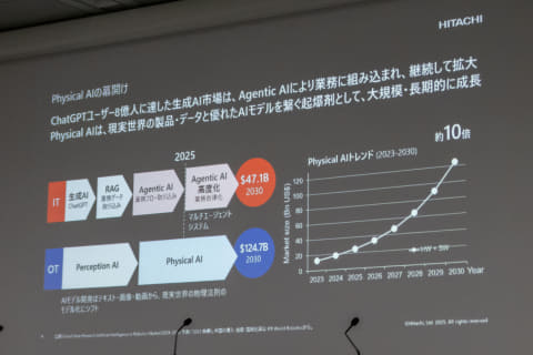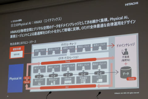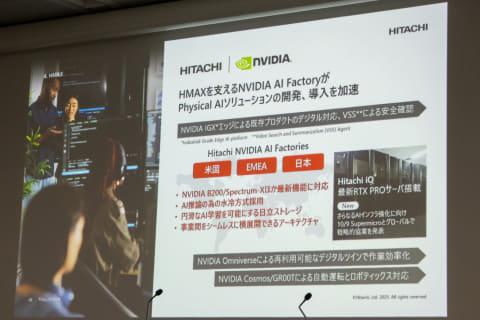 また、日本や米国、EMEAに「Hitachi NVIDIA AI Factories」を整備し、最新GPUや水冷方式への対応、HMAXアセットの事業間再利用を前提としたアーキテクチャで、フィジカルAIモデルの開発・導入を加速している。