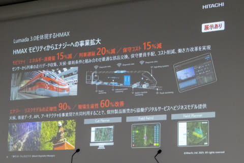HMAXは、鉄道事業者向けに列車や信号、インフラ管理を最適化する用途から始まった。車上センサーの走行データに天候や摩耗条件を組み合わせることで、部品交換や保守要員配置を最適化し、エネルギー消費15%減、列車遅延20%減、保守コスト15%減といった効果をもたらした。