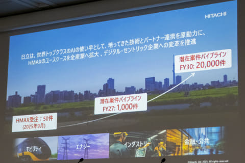 HMAXの受注は25年9月時点で50件だが、AIの進化とともに27年度には1,000件、30年度には20,000件への拡大を見込んでいる。