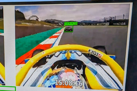 ノーチラス・テクノロジーズの高速RDB(リレーショナルデータベース)「劔“Tsurugi”」と、AIによるリアルタイム画像解析で実現する技術で、走行中のレーシングカーに搭載したカメラの映像から、3秒後の走行状態を瞬時に予測し映像を生成。生成した映像はレーサーのヘルメットのシールド上に表示される。