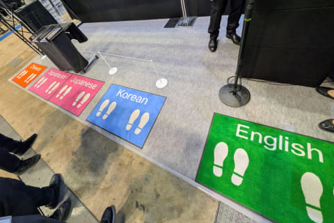 これは、AIによる多言語同時通訳技術と、特定エリアに特定の音だけを届けるマルチスポット再生技術を組み合わせたもの。デモでは英語の音声をAIが日本語・中国語・韓国語の3言語へ、音声から音声および文字へ同時翻訳し、マルチスポット再生スピーカーにより立ち位置ごとに1言語のみが聞こえるようにしている。