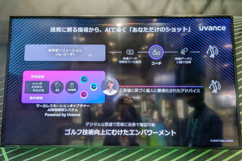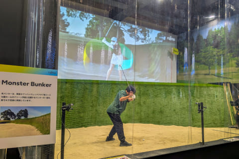 富士通のブースでは、AIによるゴルフコーチングのデモとして、高低差1.6mのバンカーに挑戦できる。東急セブンハンドレッドクラブ西コースの18番ホールにある名物バンカーを忠実に再現し、バンカーショットを通じてAIからゴルフのアドバイスを受けられる。