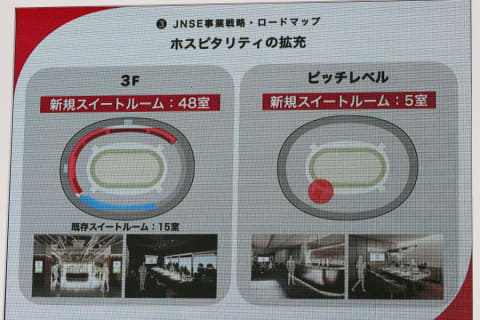 26年4月をめどに、飲食施設を刷新するほか、3階に新規のスイートルームを48室整備。また、ピッチレベルにも5室のスイートルーム新設するなど、スタジアムとしての付加価値を高めていく。