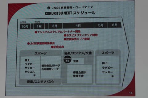 26年からのプロジェクトについては「KOKURITSU NEXT」(コクリツ・ネクスト)というテーマを掲げ、スポーツだけでなく、文化、教育、環境、観光、地域創生などの共創施策に取り組む。これまでの陸上、ラグビー、サッカーだけでなく、ラクロスの試合も予定しているほか、音楽などのエンタメも毎週展開し、年間120日以上の稼働を目指す。