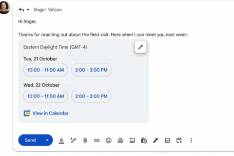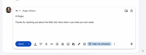 会議日程の調整が必要なメールへの返信時に、ツールバー上に「Help me schedule」ボタンが表示される。これを選択すると、Geminiがカレンダーの空き状況やメールの内容を元に会議時間を自動で提案。提案された時間帯はメール本文に直接追加され、相手が都合のよい時間を選択できる。