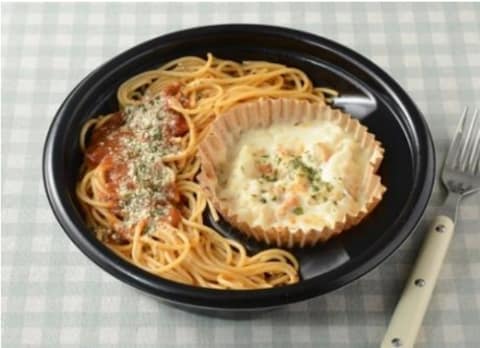 よくばりセットメシ ミートソース&マカロニグラタンは、肉とトマトの旨みを生かしたミートソースパスタと、鶏もも肉と玉ねぎ入りのマカロニグラタンのセット。発売日は11月4日。