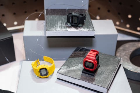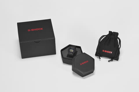 パッケージはコレクションボックスをイメージした専用パッケージ。Gマークをかたどったシリコーン製のディスプレイスタンドが同梱される。ベゼル・バンドの主な樹脂パーツはバイオマスプラスチック。