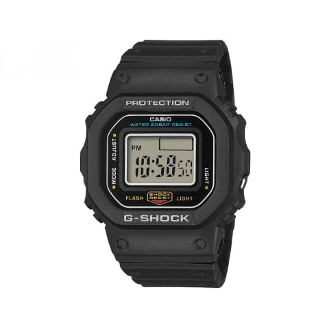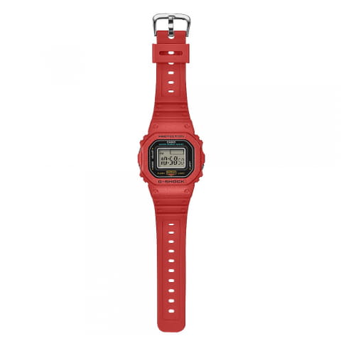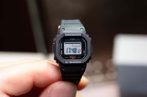 6桁表示のデジタル液晶はG-SHOCKの5600シリーズをオマージュしたデザイン。時・分・秒、カレンダー、デュアルタイム、ストップウオッチなどの機能にも対応する。3つのサイドボタンはすべて可動し、モード切り替えやライト点灯などの各種操作が行なえる。