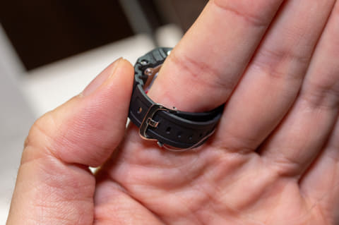 G-SHOCKの定番モデル5600のフォルムを、約1/10スケールにダウンサイジングした指輪サイズの時計。G-SHOCKの耐衝撃構造も再現しており、G-SHOCKシリーズと同じ耐衝撃試験をクリアし20気圧防水も実現している。バンドや尾錠も再現、装着サイズ(約48~82mm)を調整でき、指だけでなくアクセサリーとしてさまざまなものに取り付けられる。
