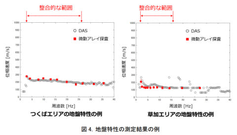 比較として、産総研が開発した「微動アレイ探査」用の小アレイを同様のエリアに設置して計測を行なったところ、光ファイバ振動センサを使用した場合とほぼ同様の波形を得られることが分かった。「微動アレイ探査」は人員を現地に派遣して設備を置いて計測するが、光ファイバ振動センサの計測ではNTTの施設に装置を設置するだけで計測が可能になる。